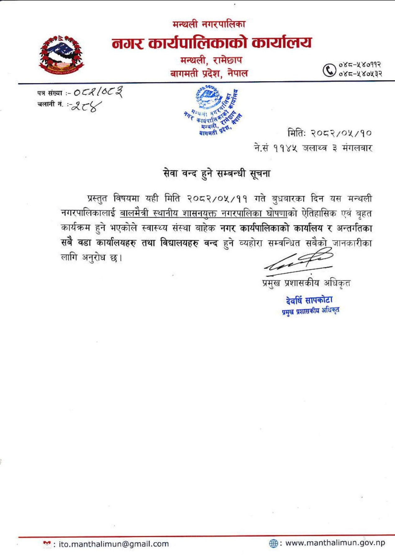 रामेछाप । मन्थली नगरपालिकाले भोली बुधबार नगरपालिका भित्र स्वास्थ्य सेवा बाहेक नगरपालिका, वडा कार्यालय र विद्यालय बन्द गर्ने निर्ण..