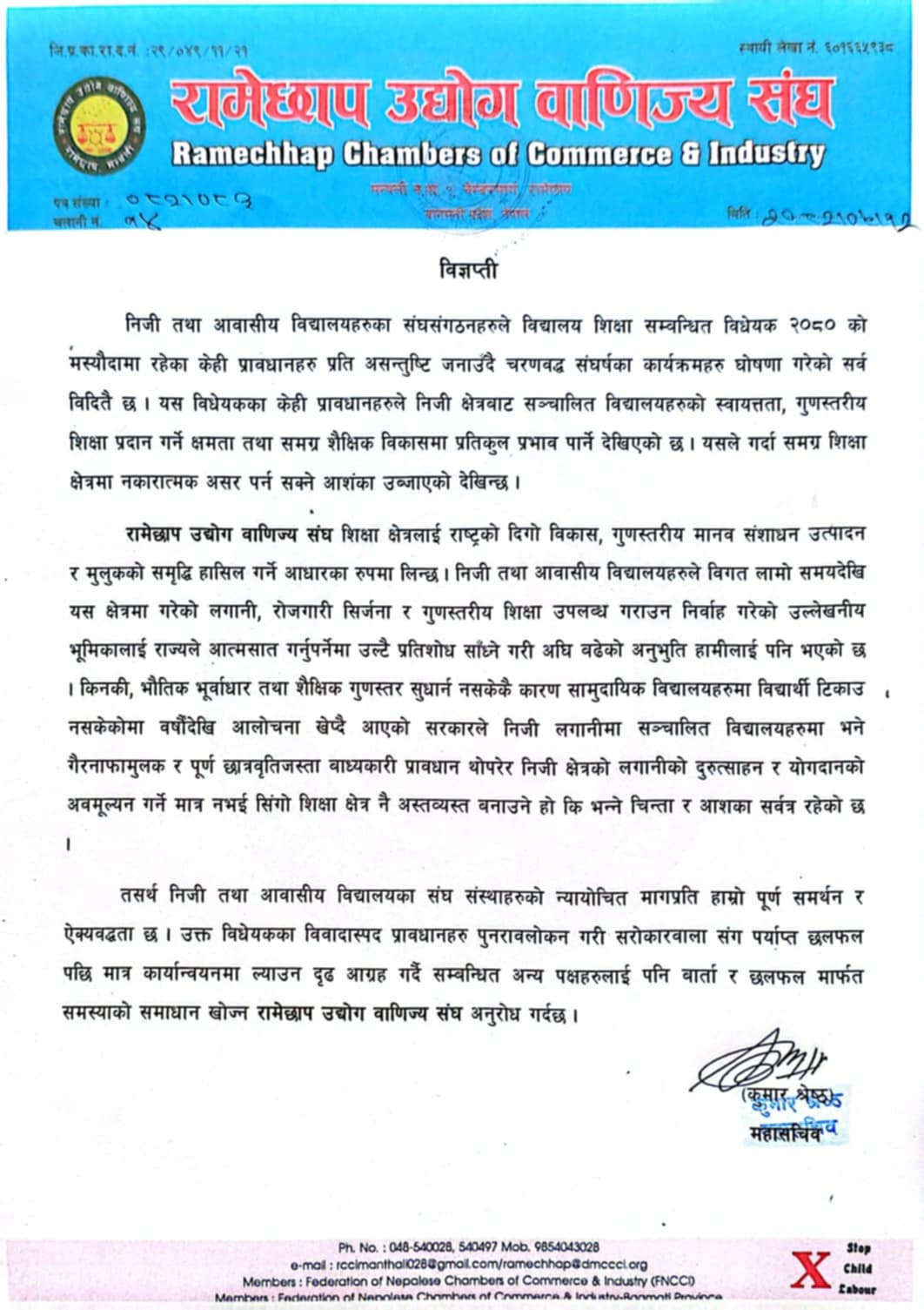 रामेछाप । रामेछाप उद्योग वाणिज्य संघले शिक्षा संग सम्बन्धि विधेयक २०८० मा भएका विवादास्पद प्रावधानहरु पुनरावलोकन गरी सरोकारवाला ..