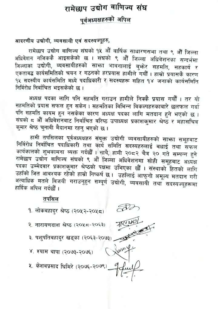 रामेछाप । रामेछाप उद्योग वाणिज्य संघका ५ जना पूर्व अध्यक्षहरुले भावि अध्यक्षका लागि उम्मेदवार बनेका प्रकाशकुमार श्रेष्ठको पक्षमा मतदान गर्न व्यवसायीहरुलाई अपिल गरेका छन् ।